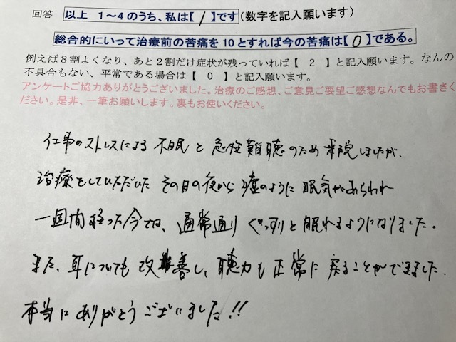 仕事のストレスによる不眠と。急性難聴のため来院しましたが。治療をして頂いたその日の夜から、嘘のように眠気が現れ、1週間たった今では通常通りぐっすりと眠れるようになりました。また耳についても改善し聴力も正常に戻ることができました。本当にありがとうございました。以上 患者さんのコメント、アンケートは2回の施術 1週間後にいただいています。2025/12/14掲載