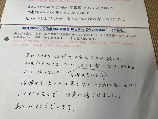 2回治療したところ 聞き取りにくさはなくなりました。 耳鳴りは 夜 眠る時に少し気になるくらいと改善しました。首のコリは治りました。3回目の治療の後にアンケートをいただき4回目で卒業していただきました。